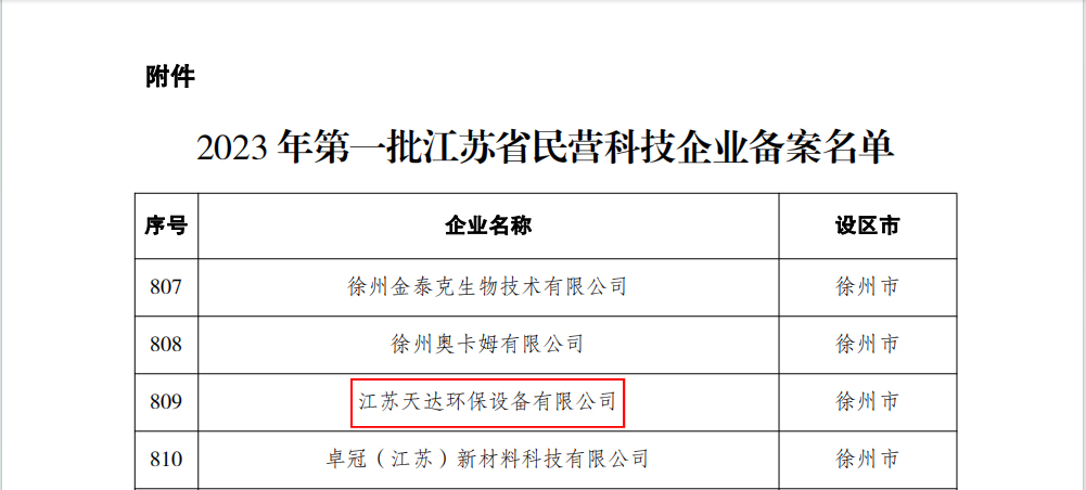 近日,江蘇省民營科技企業(yè)協(xié)會公布了2023 年第一批江蘇省民營科技企業(yè)備案名單。經(jīng)江蘇省民營科技企業(yè)協(xié)會的審查與認定,江蘇天達環(huán)保設備有限公司獲得“江蘇省民營科技企業(yè)”榮譽稱號。